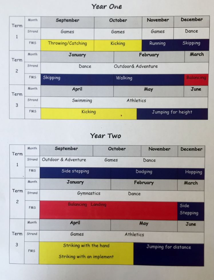 While engaging in the process of applying for our Active Flag, it was felt that our current PE policy needed to be perused and updated. During the year 2018/2019 the PE policy was updated to ensure all six strands were taught over a two-year period, which was subsequently ratified by the Board of Management. After a teacher attended training in the ‘Move often, Move well’ programme, it was deemed necessary to ensure that all fundamental movement skills were taught discreetly through each strand unit.